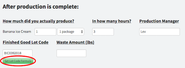 Now you can set a formula for your lot codes. For individual recipes you can input a prefix to use as well as a formula to calculate the lot code based on that prefix and the date of the production run. You'll find this option when you open a new production run (on the Daily Production Run page).